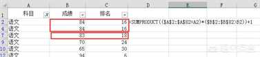 =SUMPRODUCT((科目=A2)*(成绩>B2))+1