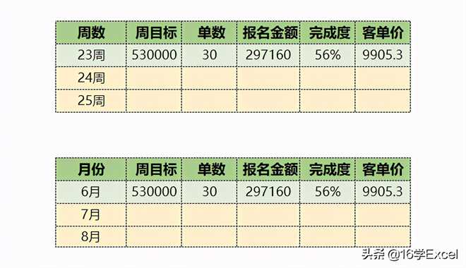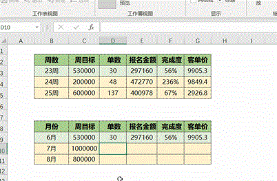 第二步:对报名单数和报名金额,分别按周和月进行汇总;求出完成度及客单价