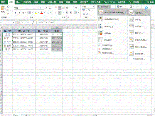 选中D列数据,单击【开始】——条件格式——突出显示单元格规则——发生日期,选择本月。如此本月过生日人员都标记出来了。