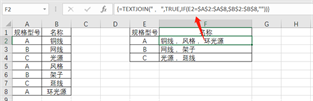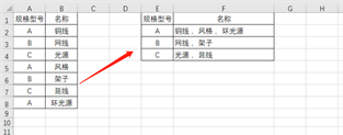 用函数,输入公式=TEXTJOIN(” ,”,TRUE,IF(E2=$A$2:$A$8,$B$2:$B$8,””)),最后按Ctrl+Shift+Enter组合键结束。