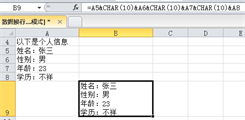 强制换行:快捷键【Alt+Enter】,由于其ASCII代码值为10,故在VBA中可以用VBA.CHR(10)表示,在工作表中可用CHAR(10)表示。