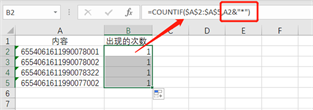 这时可以在后面添加*来处理,在单元格中输入公式=COUNTIF($A$2:$A$5,A2&”*”)