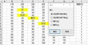 4)结果如下,黄色标记单元格前面多了一个空白单元格,接下来选择B1:H15单元格范围,按F5,定位空值