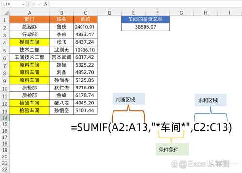 比如在这里我们想要计算下车间的总薪资,只要需要将求和条件设置为*车间*,然后正常使用sumif函数统计即可,计数也是一样的方法。