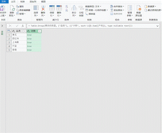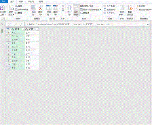 选中计数列,修改函数语句,将list sum改为:Text.Combine,在产地后添加英文双引号加逗号,这是分组之后各字符间的插入符号为逗号。