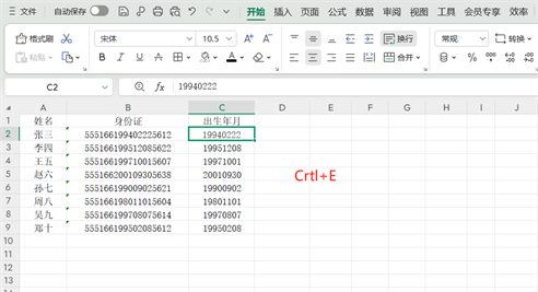 身份证号第7到14位代表出生年月日,先在首个单元格手动输入对应日期,选中该单元格后按下Ctrl+E,WPS会智能识别规律并自动填充所有结果,短短几秒就能完成以往数小时的工作量。