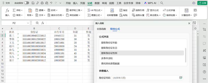 身份证第17位数字为奇数时是男性,偶数时为女性。使用公式“=IF(MOD(MID(B2,17,1),2),”男”,”女”)”,或者直接在WPS的“常用公式”里选择“提取身份证性别”,就能一键生成所有性别信息。