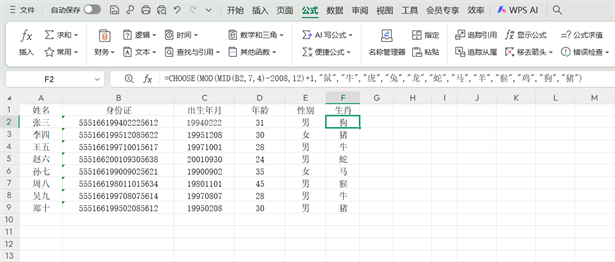 从身份证号第7到10位获取出生年份后,使用公式“=CHOOSE(MOD(MID(B2,7,4)-2008,12)+1,”鼠”,”牛”,”虎”,”兔”,”龙”,”蛇”,”马”,”羊”,”猴”,”鸡”,”狗”,”猪”)”,下拉填充即可批量得出每个人的生肖(因2008年是鼠年,故公式中减去2008)。