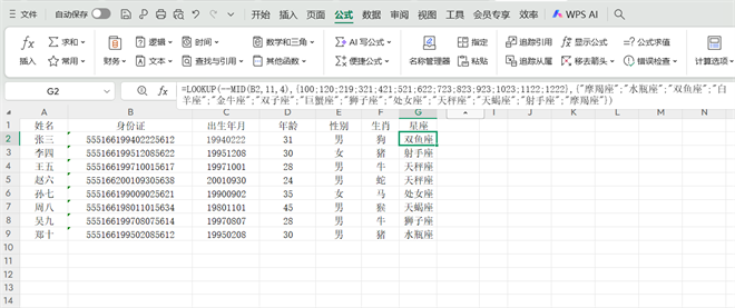 截取身份证号第11到14位的月日部分,输入公式“=LOOKUP(–MID(B2,11,4),{100;120;219;321;421;521;622;723;823;923;1023;1122;1222},{“摩羯座”;”水瓶座”;”…;”摩羯座”})”,就能根据出生日期精准得出对应星座。