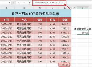 这其实是比较基础的乘法与求和的运算,我们可以先在每行计算产品的金额,最后再将计算出来的金额列进行求和汇总。