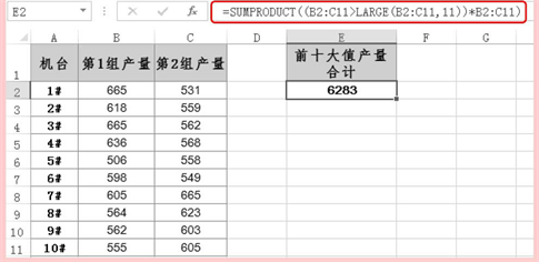 表格按不同机台分别统计了第1组和第2组的产量值,可以使用LARGE函数与SUMPRODUCT函数计算排名前10位的产品的合计值。