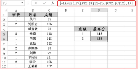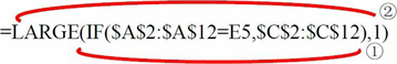 =LARGE(IF($A$2:$A$12=E5,$C$2:$C$12),1)