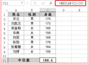 例如,当前数据表中统计了学生的身高,现在要统计出身高值的中位数,可以使用MEDIAN函数来计算。