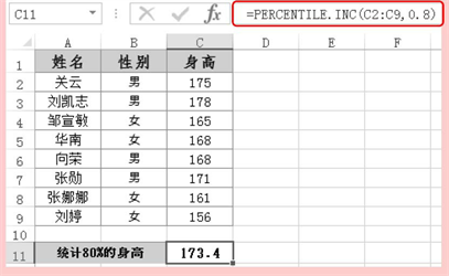 当前数据表中统计了学生的身高,现在需要统计出80%的身高值。