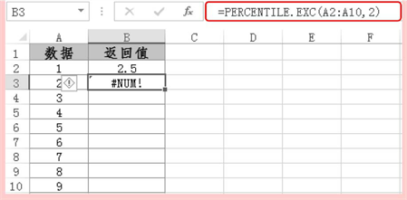按“Enter”键即可看到由于百分点的值大于1返回“#NUM!”错误显示,如图2所示。