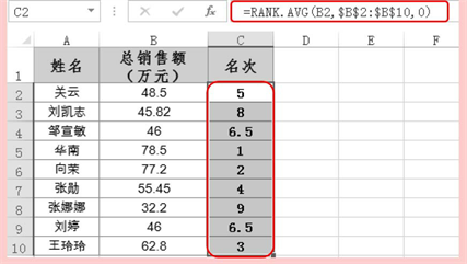 ➋ 选中C2单元格,拖动右下角的填充柄向下复制公式,即可完成对所有销售额的依次排位,如图1所示(注意用这个函数后,当两个销售额名次相同时,返回的是平均值排位)。