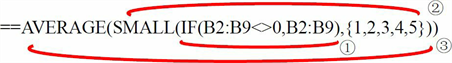 =AVERAGE(SMALL(IF(B2:B9<>0,B2:B9),{1,2,3,4,5}))