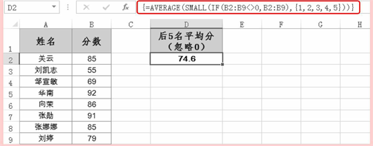 实例1 统计成绩表中后5名的平均分(忽略0值)