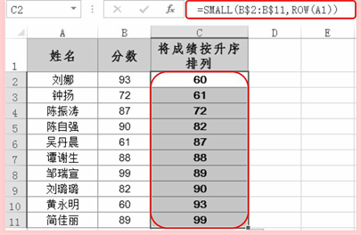 ➋ 选中C2单元格,拖动右下角的填充柄向下进行公式填充,即可将学生成绩按照升序进行排列,如图2所示。