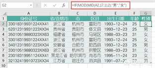 身份证号的倒数第2位,也就是第17位,如果是奇数,那么为男性,如果为偶数,则为女性,所以在G2单元格中输入公式: