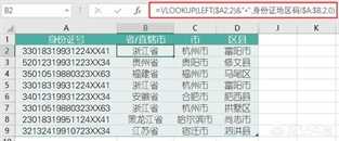=VLOOKUP(LEFT($A2,2)&”*”,身份证地区码!$A:$B,2,0)