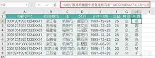 =MID(“猴鸡狗猪鼠牛虎兔龙蛇马羊””,MOD(MID(A2,7,4),12)+1,1)