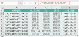 身份证号的第7位至第13位是表格出生的年月日,在E2单元格中输入公式: