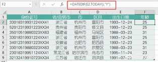 =DATEDIF(E2,TODAY(),”Y”)来计算年龄
