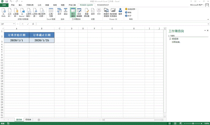 首先我们复制文件所在的文件夹的路径,找到Power Query界面,从文件中的Excel表导入并进入编辑界面,我们先模拟一下筛选的效果,点击订单开始日期这一列。筛选选择介于,我们随便选择一个时间段,筛选结果就出来了,点击高级编辑器,在首行输入(开始日期 as date,结束日期 as date)=>,并将后面的两个日期分别修改成刚才定义的名称。完成后点击关闭并上载,会以连接的形式上载。