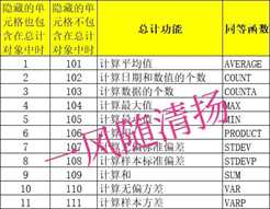 以编号形式指定总计时采用的功能.当指定为1~11时,隐藏的单元格也在总计的对象之内.当指定为101~111时,则忽略隐藏的单元格,不将其视为总计对象.2003版以后的版本才支持此功能.