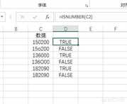 对于上面的数据,可以在D2单元格输入函数=ISNUMBER(C2)后向下填充,这个函数表示数值判断,如果是数字,那么返回结果为true,否则返回false。