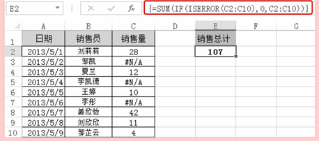 表格显示了各个销售员的销售量记录,其中有错误值显示,可以使用ISERROR函数进行销售量统计。