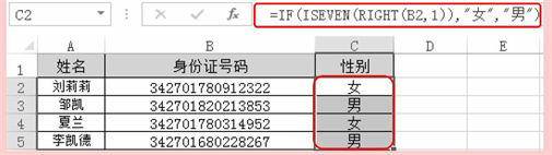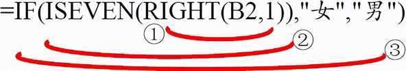 =IF(ISEVEN(RIGHT(B2,1)),”女”,”男”)