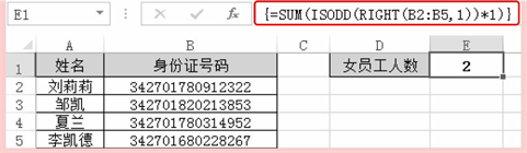 在15位身份证号码中,最后一位如果为偶数,表示持证人性别为“女”,反之为“男”,因此可以根据此特征来变相统计公司女性员工人数。