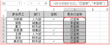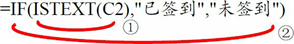 =IF(ISTEXT(C2),”已签到”,”未签到”)