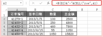按“Enter”键,即可将B列中的签单日期转换为序列号再加上行号成为本订单的订单编号。