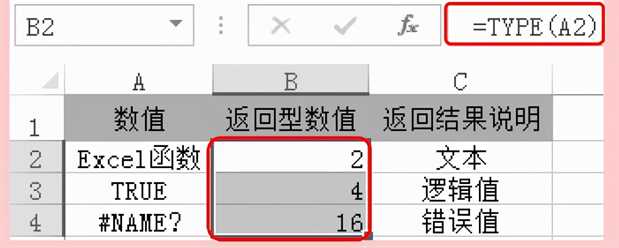 最佳答案TYPE函数用于返回数值的类型。函数语法TYPE(value)参数解释value:必需。可以为任意Microsoft Excel数值,如数字、文本以及逻辑值等,如表1所示。如果value为函数TYPE返回数字11文本22逻辑值44误差值1616数组6464实例1 返回任意数值的类型➊ 选中B2单元格......
