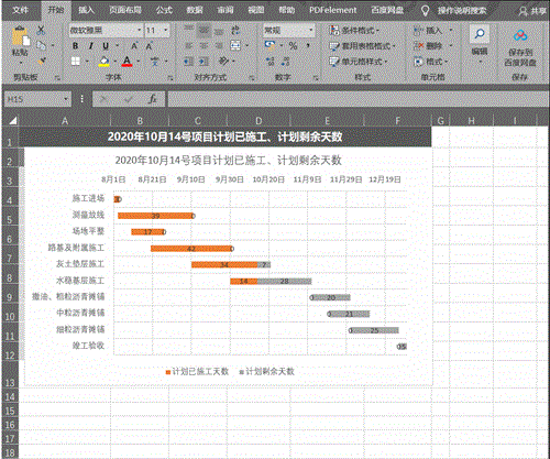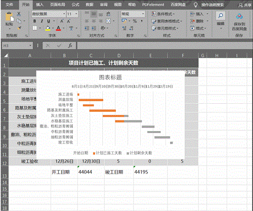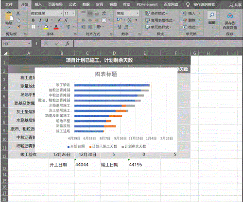 设置图表标题=TEXT(TODAY(),”yyyy年m月d号”)&”项目计划已施工、计划剩余天数”。