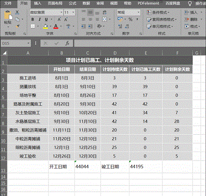 其中:计划已施工天数“=IF(B3>TODAY(),0,IF(C3<TODAY(),D3,TODAY()-B3))”;