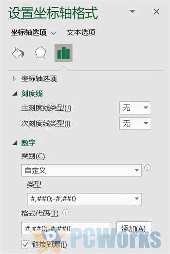 在侧边栏的轴选项下面,你还可以展开刻度线和数字来调整图表上的点、类别和格式代码。