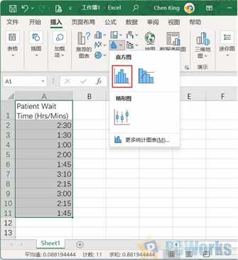 在Excel中插入图表实际上是很容易的。假设你已经准备好你的数据,选择它。然后,前往 “插入 “选项卡,点击 “插入统计图 “箭头,选择直方图(在左边)。