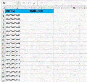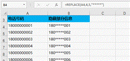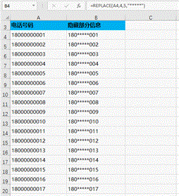 1、将B4单元格公式改为REPLACE(A4,4,5,”*”),将最后1个参数由5个*改为1个*,相当于用1个*号替代了5个字符(实例中是用1个*号替代1个数字),效果如下: