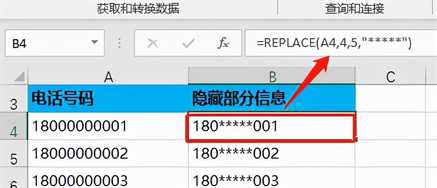 B4单元格公式=REPLACE(A4,4,5,”*****”)