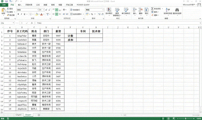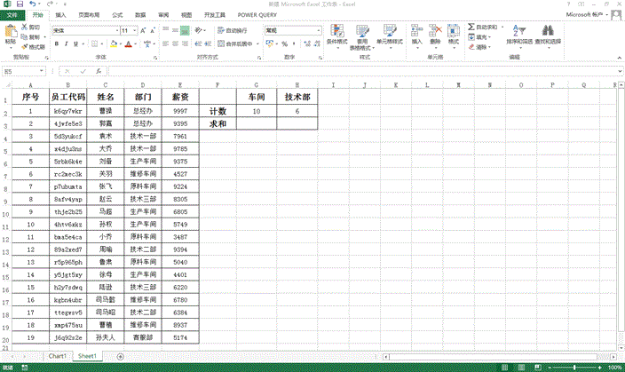 求和也差不多,公式分别是=SUMIF(D2:D20,”*”&”车间”,E2:E20),=SUMIF(D2:D20,”技术”&”*”,E2:E20)。