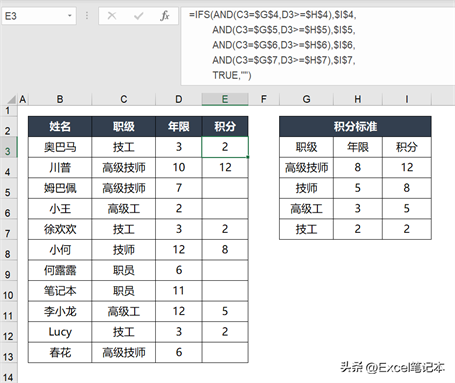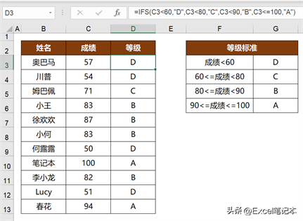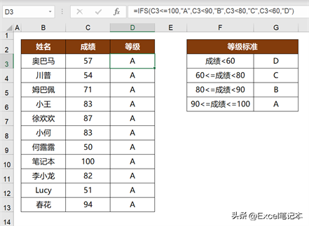 Excel笔记:IFS依次执行条件判断,一旦条件成立,输出对应结果并终止程序,不再往下执行。