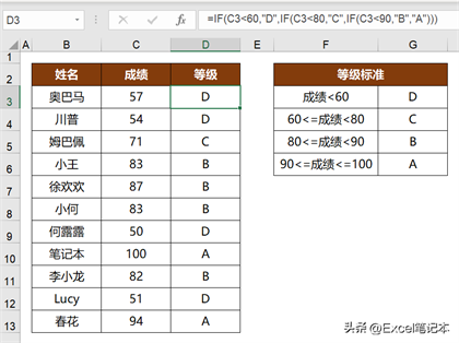 小技巧:书写公式时可以默念或小声念:如果C3小于60,那么输出D,如果C3小于80,那么输出80……