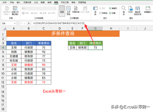 公式:=LOOKUP(1,0/((A4:A12=E4)*(B4:B12=F4)),C4:C12)