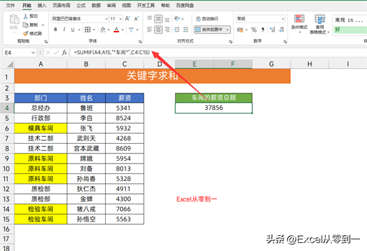 公式:=SUMIF(A4:A15,”*车间*”,C4:C15)