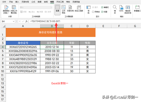 提取生日:=TEXT(MID(A4,7,8),”0-00-00″)