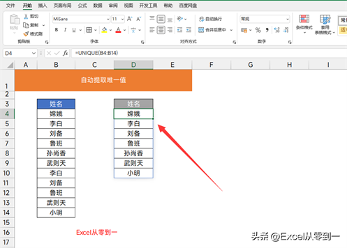 公式:=UNIQUE(B4:B14)